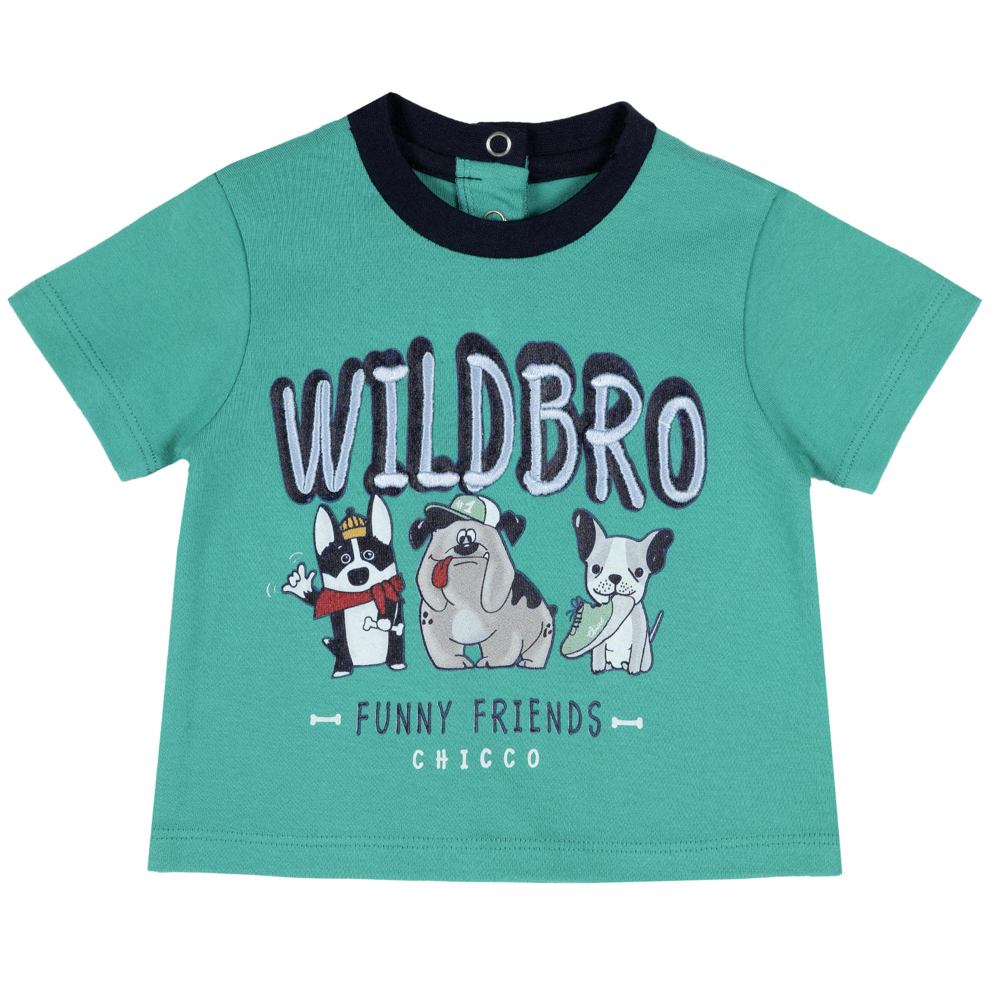 Футболка Funny friends для хлопчика, з короткими рукавами та круглим вирізом горловини.Особливості: сертифікована OEKO-TEX®;материал – 100% бавовна;декорована принтом;на спинці застібається на кнопки. Цвет:Бірюзовий|Размер:80, 74 Chicco
