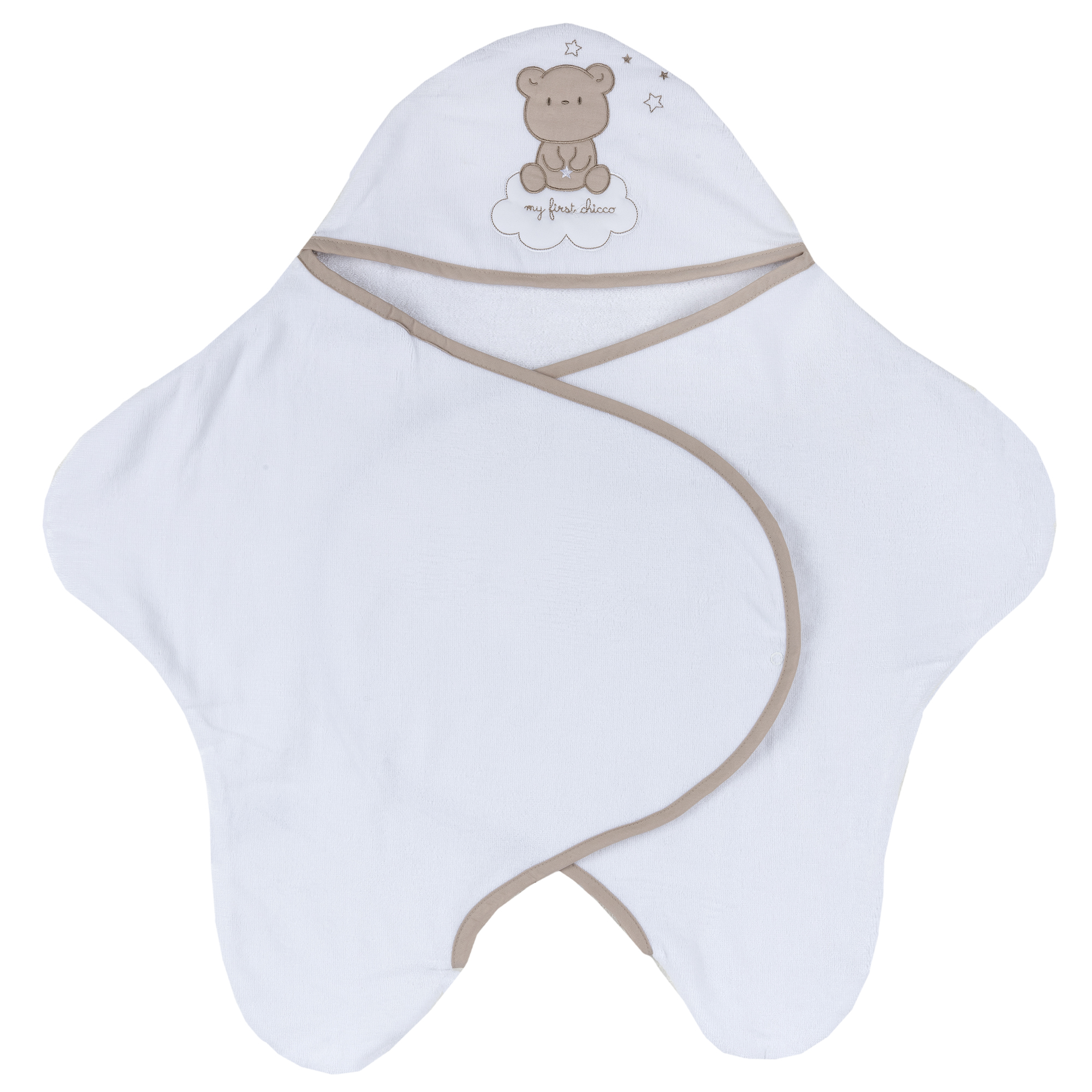 Рушник-конверт “Fairy clouds” з капюшоном.Особливості рушника:сертифіковане OEKO-TEX®;матеріал – 100% бавовна;капюшон декорований аплікацією;застібається на кнопки.Рушник виготовлено з натуральної бавовни, м’яке та відмінно вбирає воду. Chicco